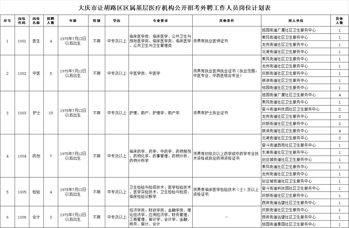 (四)具有符合招聘崗位要求的學(xué)歷、專業(yè)、年齡等條件,詳見《大慶市讓胡路區(qū)區(qū)屬基層醫(yī)療機(jī)構(gòu)公開招考外聘工作人員崗位計劃表》(附件1);