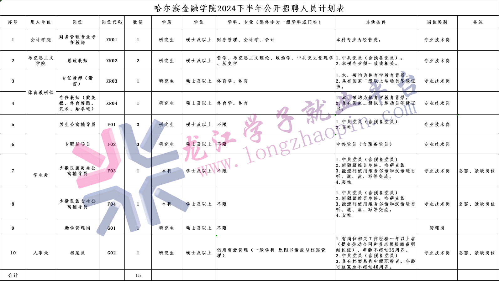 招聘人數(shù)詳見(jiàn)附件1-《哈爾濱金融學(xué)院2024下半年公開(kāi)招聘人員計(jì)劃表》。